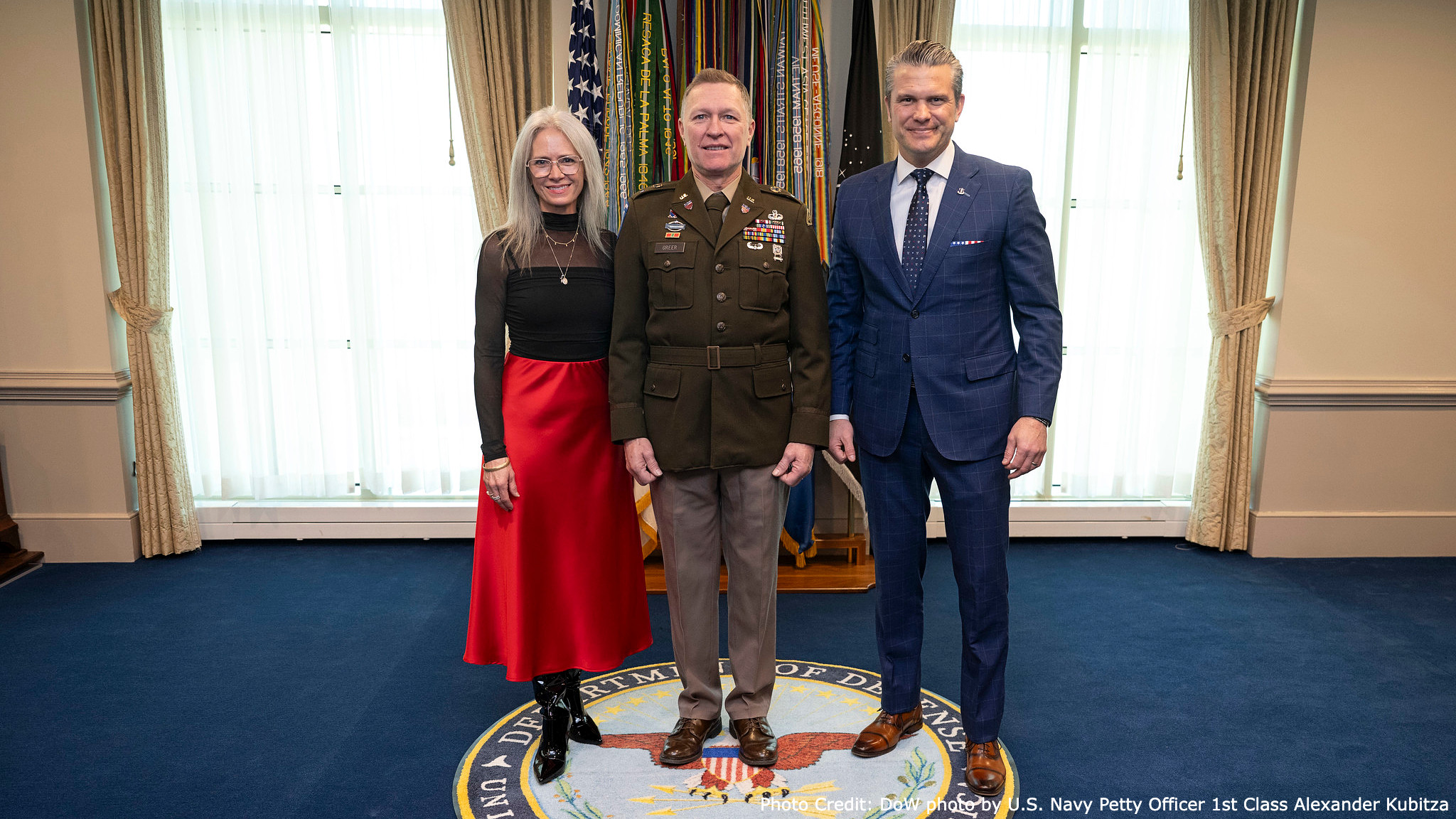 Left to right: Craig Morgan, Karen Greer (wife of Craig Morgan), Pete Hegseth | Photo credit: DoW photo by U.S. Navy Petty Officer 1st Class Alexander Kubitza